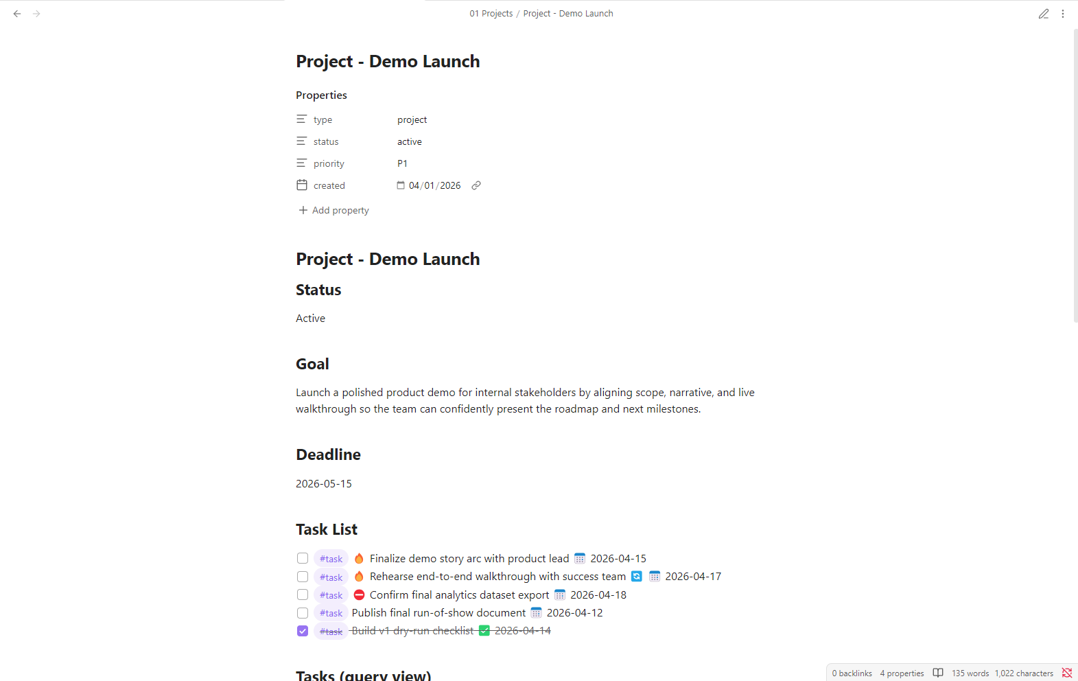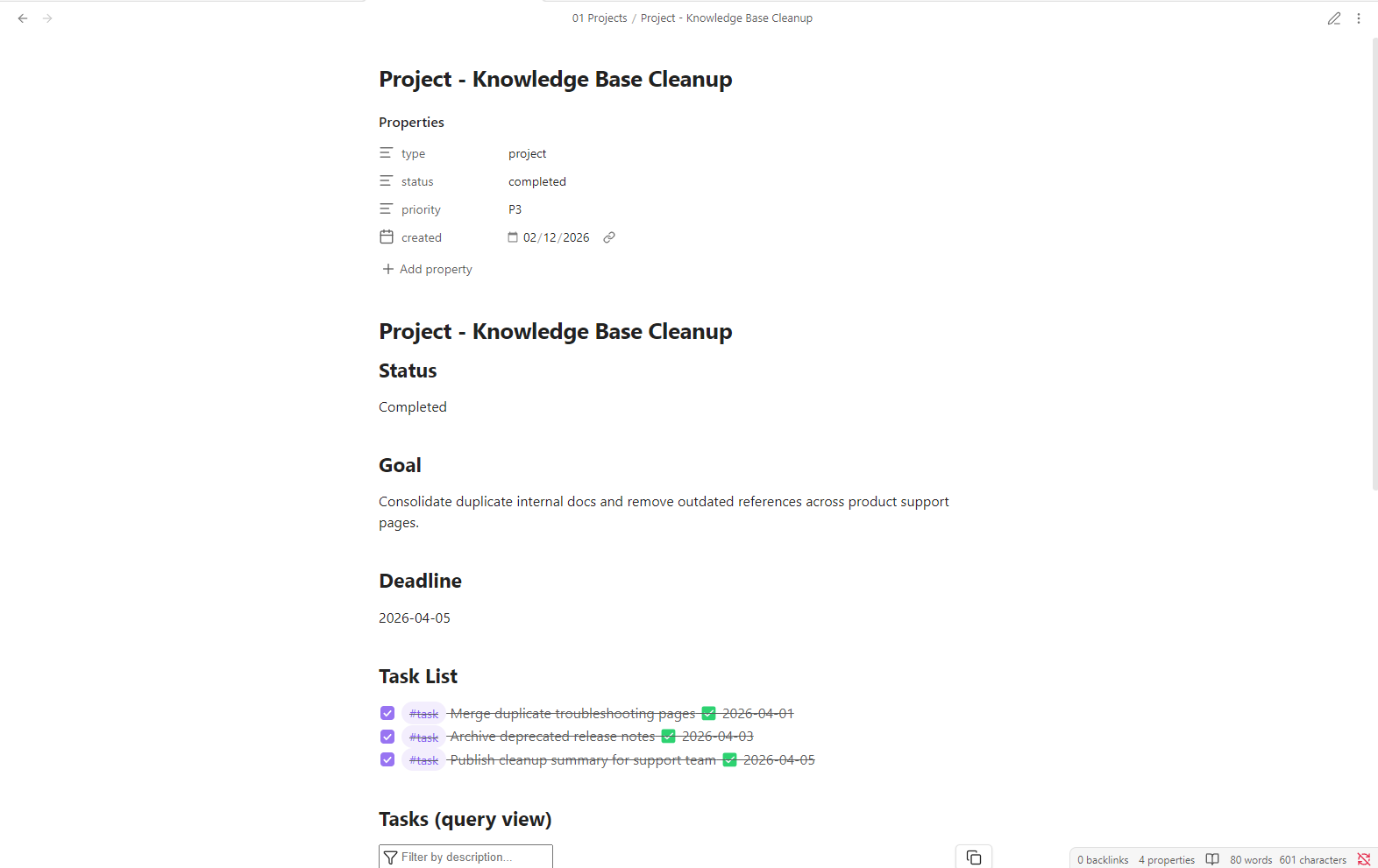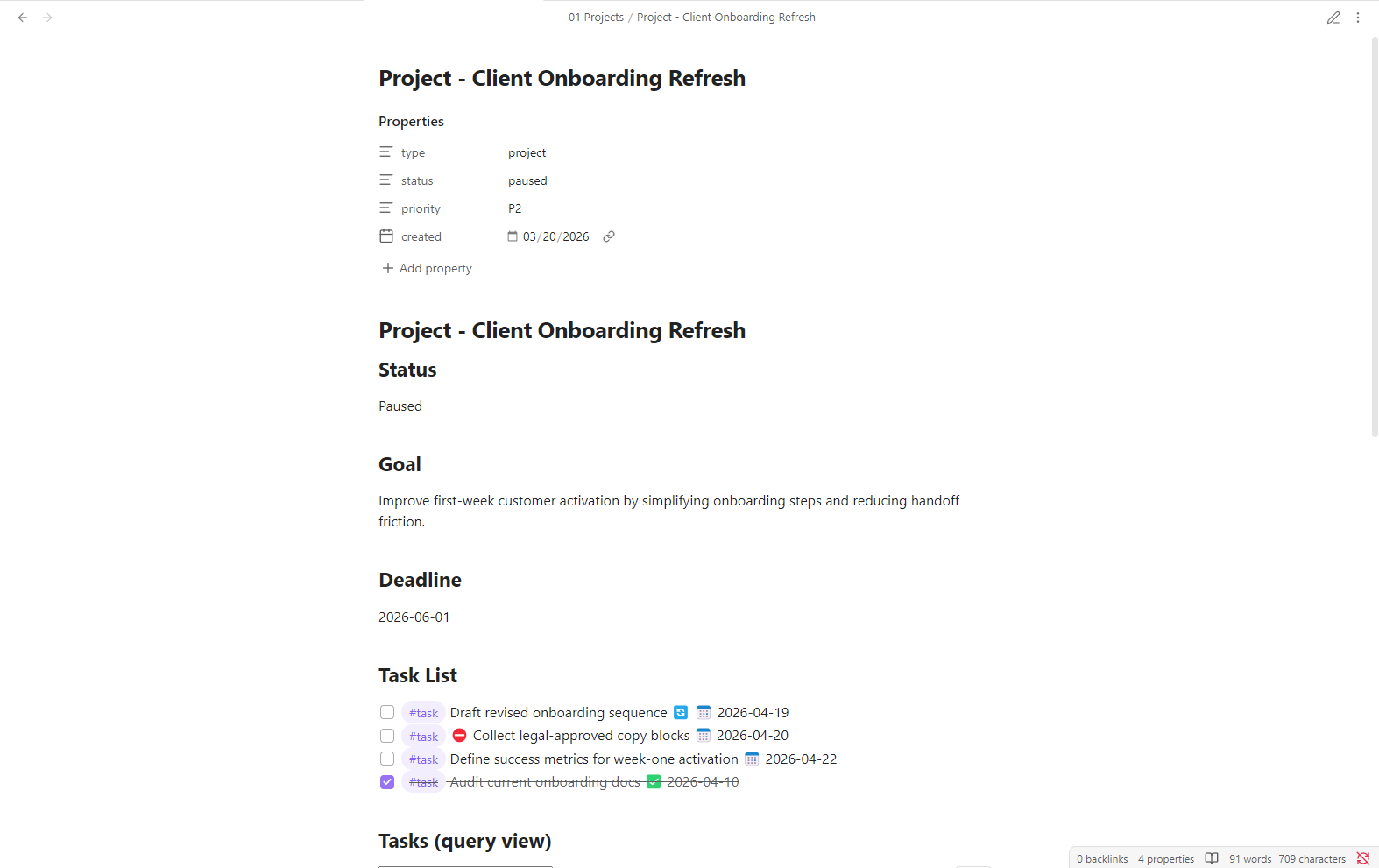 Sample project pages showing how work can be captured and tracked inside the vault.